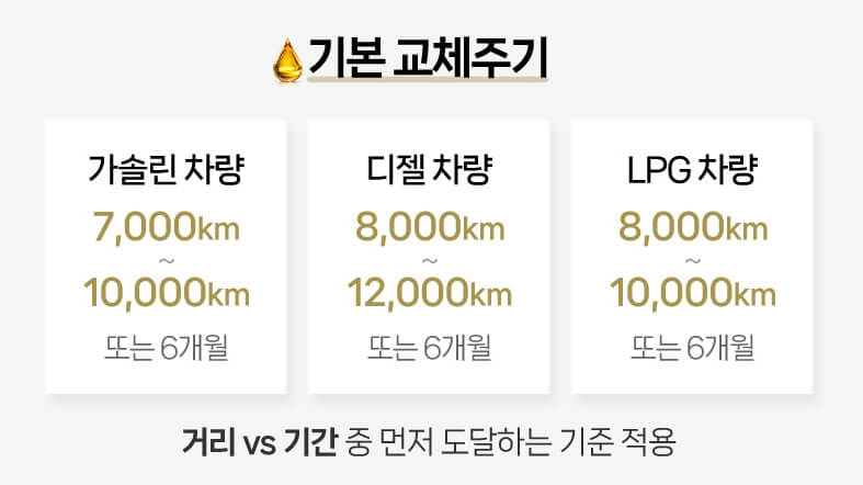 | 오일 종류별 | 광유(경제성) vs 합성유(고성능/롱라이프) | 광유(5천km) / 합성유(1만~1.5만km) |