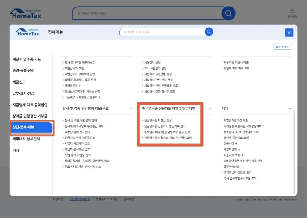 3. 상담/제보 메뉴 선택: [현금영수증 미발행 신고] 메뉴를 찾으시면 됩니다.