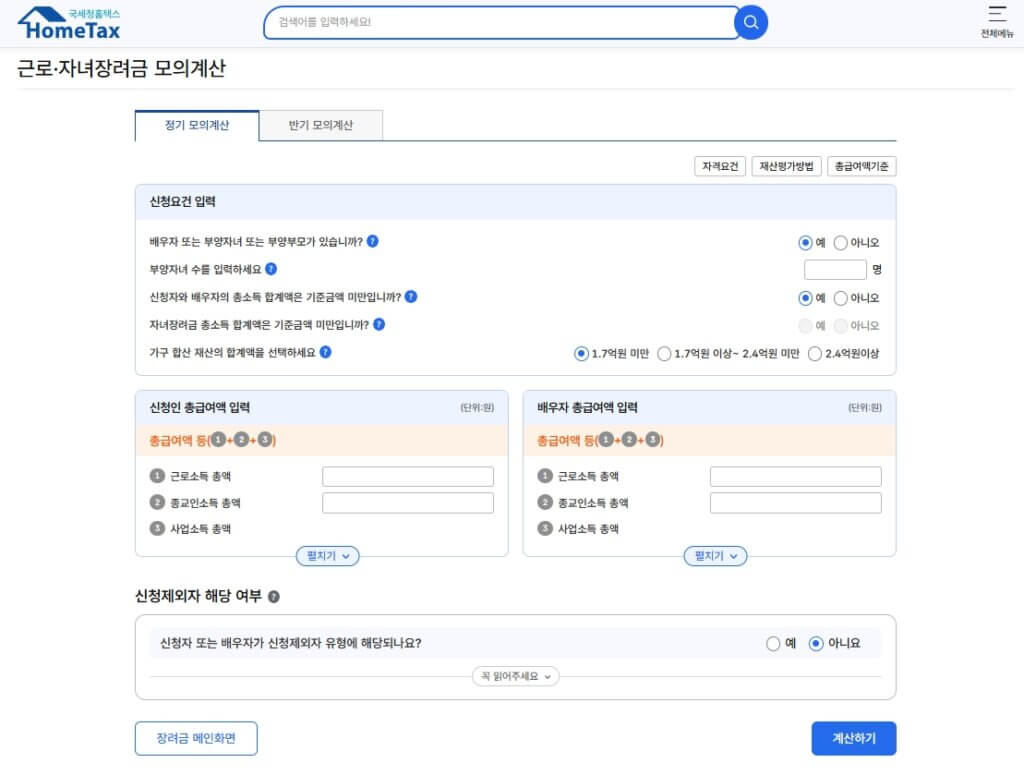 첫째, 본인의 소득과 재산이 간당간당하다고 느껴진다면, 무작정 신청 버튼을 누르기 전에 국세청에서 제공하는 모의계산 서비스를 반드시 돌려보아야 합니다. 이 과정을 통해 내가 정확히 어떤 가구 유형으로 분류되는지, 잊고 있던 시골의 낡은 상속 토지나 자동차가 재산에 잡혔는지 미리 시뮬레이션해 볼 수 있습니다.
